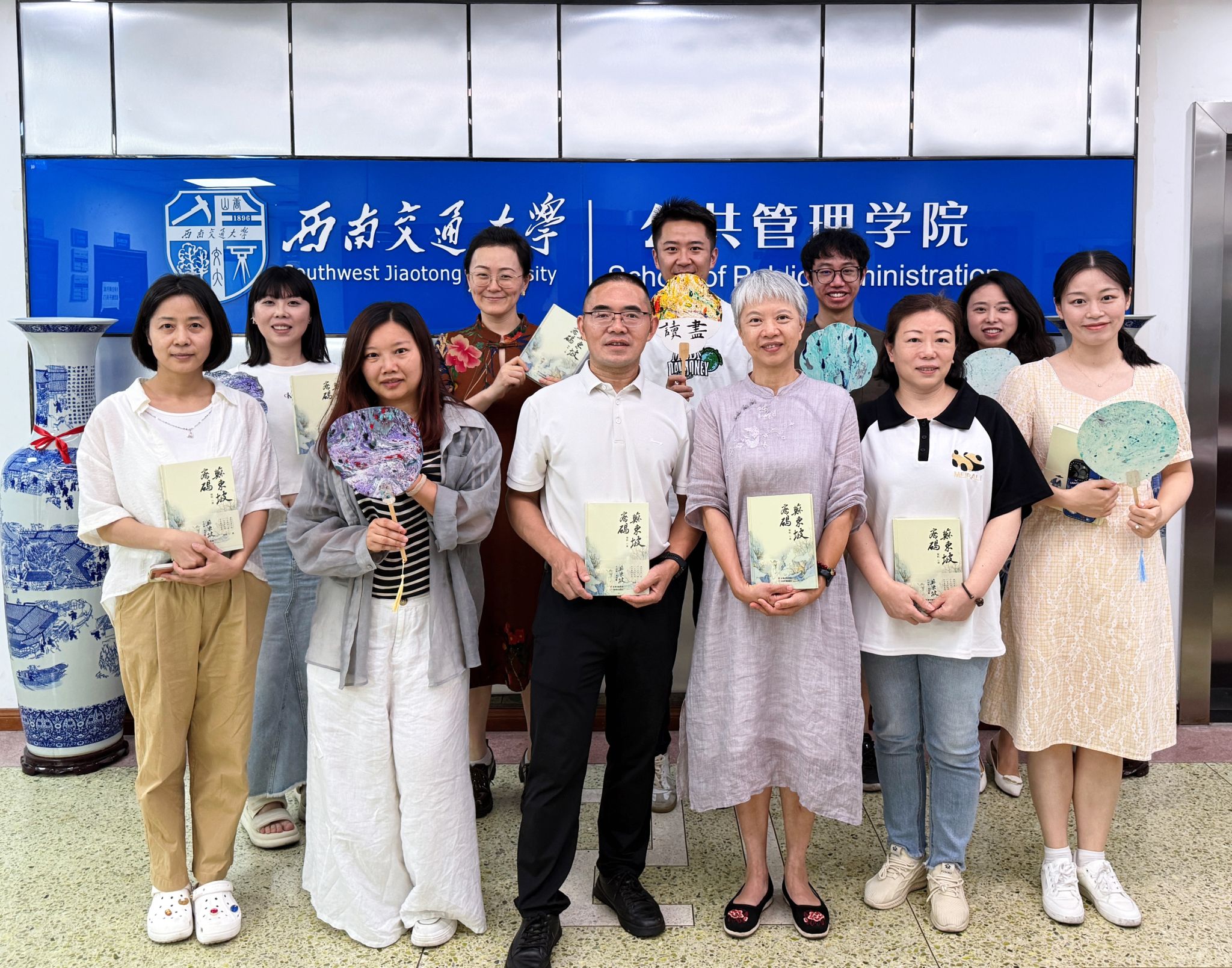 最后,高凡教授在总结中谈到,苏轼不仅在黄州赤壁写下“大江东去”的豪迈词章,更在杭州任上践行着“造福一方”的责任担当。在逆境中坚守治理初心、在困局中创新治理路径的精神深刻诠释了当代公共管理者所需的韧性品格与创新智慧,是每一位公共管理从业者的“必修课”。现场师生纷纷表示此次活动收获颇丰,本次读书分享会活动在师生手持题字漆扇的合影中圆满结束。