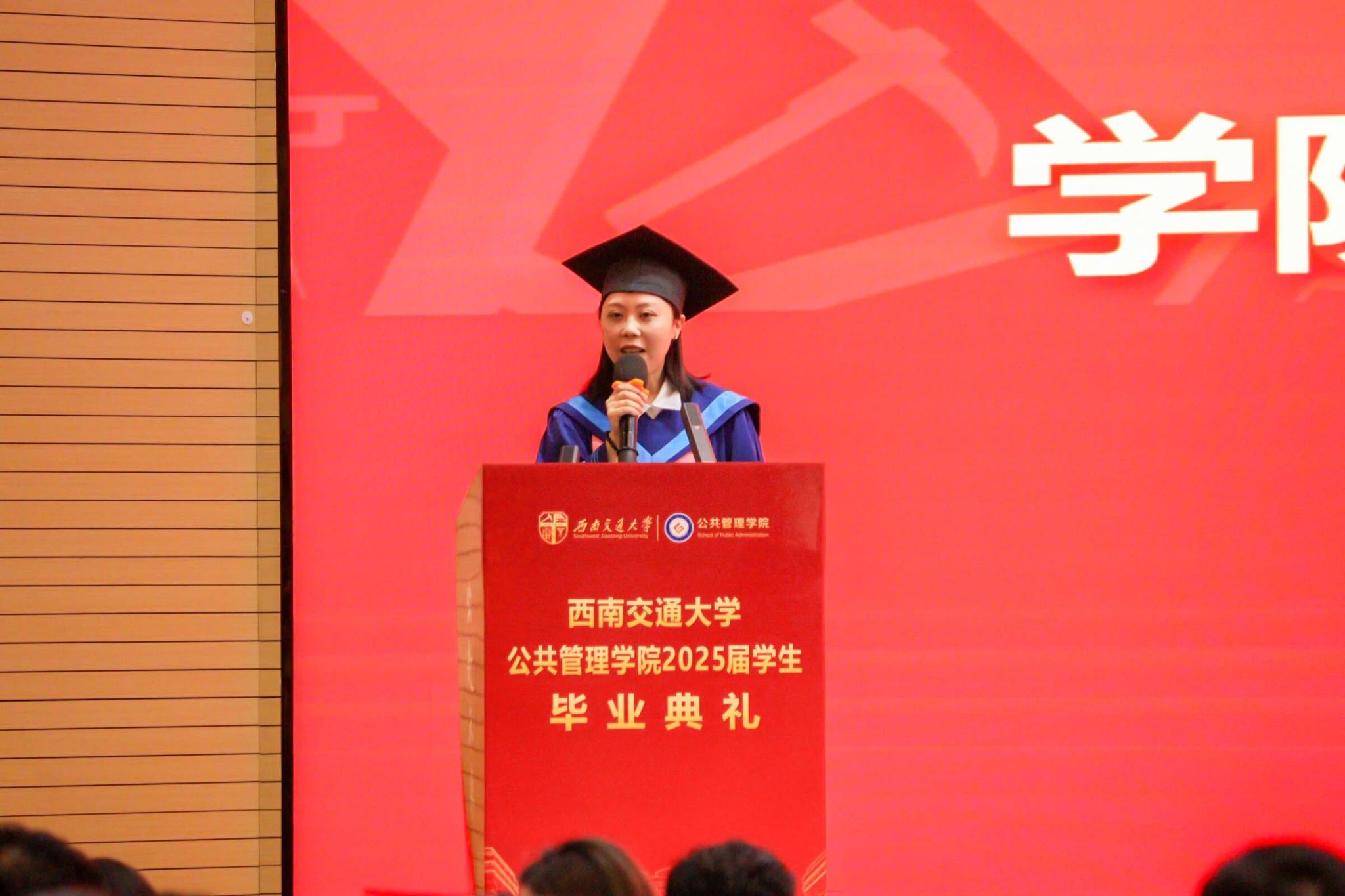 MPA毕业生代表张守婧登台,缓缓回溯硕士生涯,桩桩件件,都是青春里最珍贵的刻度。话语真挚,致谢恩师倾囊相授,祝福同学们前程似锦。